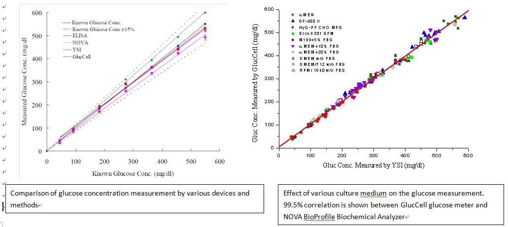 The improved accuracy in the low and high glucose range means better detection for cell culture decisions. In addition, the consistency, accuracy, and linearity of measurement using portable GlucCell meter is independent of ingredients or serum-related components of the culture medium.