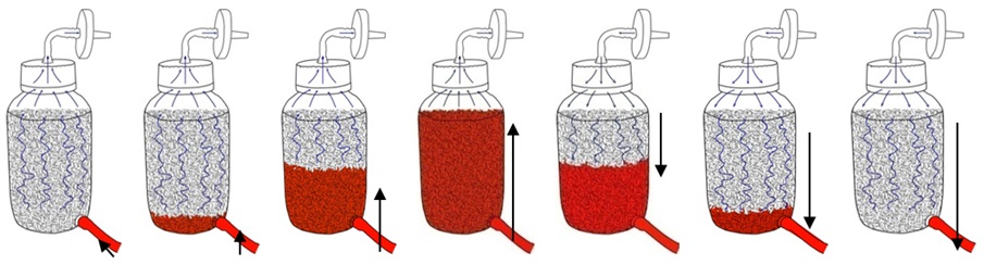 The culture medium in the external mixing bag, homogenized by different agitation methods, flows between the matrix vessel in the incubator and mixing bag by the switch-over of negative / positive air pressures, submerging the matrices where cells attach. As a result, the matrices are submerged and exposed to air periodically. During the submerging phase, fresh nutrients replenish, and metabolic wastes are diffused and then carried away. Meanwhile, the carbon dioxide is forced to exhaust. During aeration, clean air is introduced and contacts with the porous matrices through a thin liquid film. The oxygen transfer efficiency is maximized. The culture medium is re-mixed and tuning for pH/DO in the mixing bag.